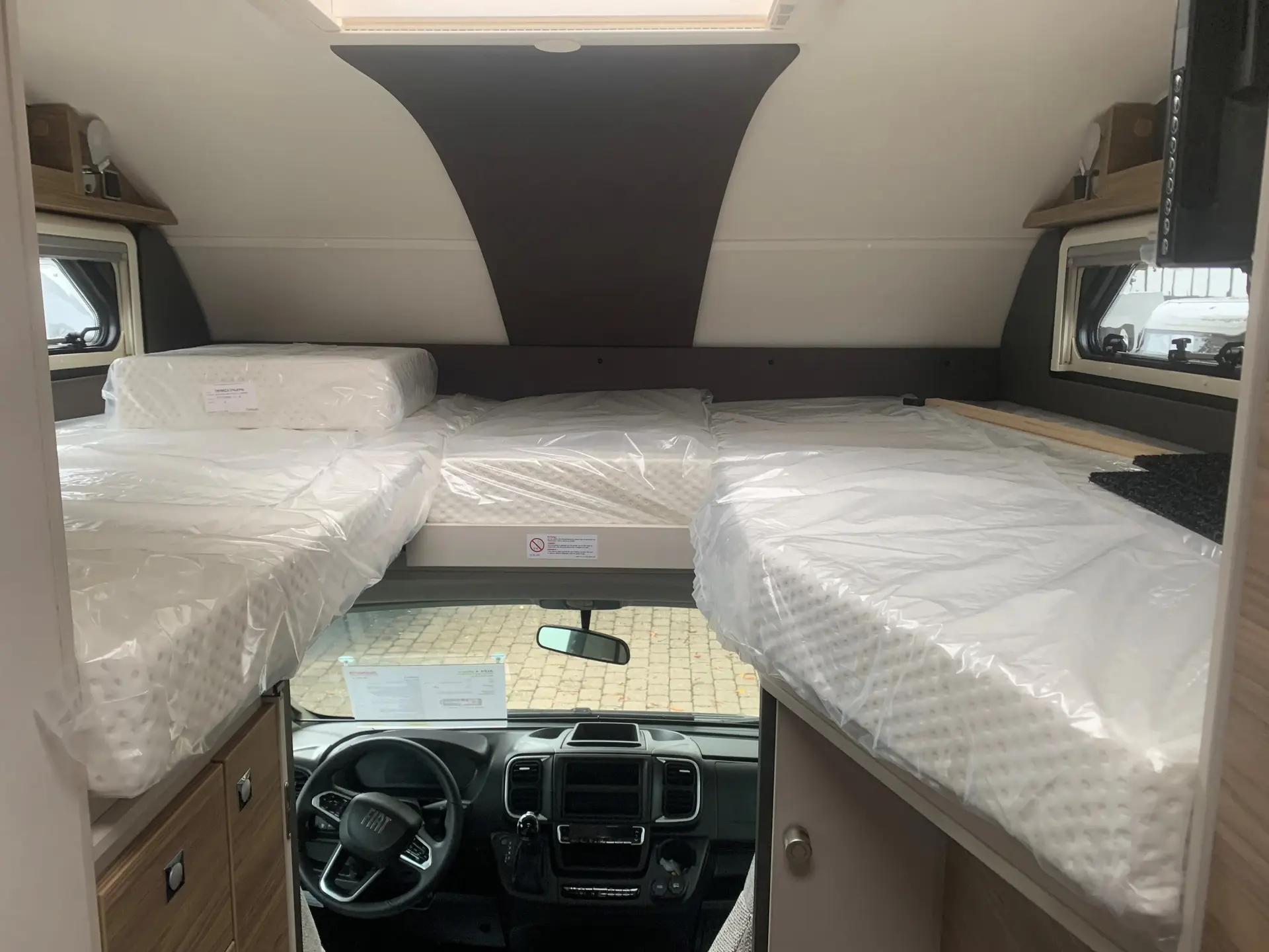 - Travel-Paket A 7820-2 (Light Moments: Indirekte Ambientebeleuchtung über den Dachstauschränken, Verdunklungsjalousien im Fahrerhaus, Dunstabzugshaube (Abluft) mit Zugluft-Stopper, Stützen (2 Stk.) für Anbau hinten, Automatische Gasflaschenumschaltung inkl. Crash Sensor, EisEx und Gasfilter, Rückfahrkamera (Einfachkamera), Panoramafenster (zweite Panoramadachhaube 75x105 cm längs über Sitzgruppe Heck) inkl. Baldachin und Raumleuchte, Zentralverriegelung für Fahrerhaus-, Wohnraumtüre und Garagentüren)