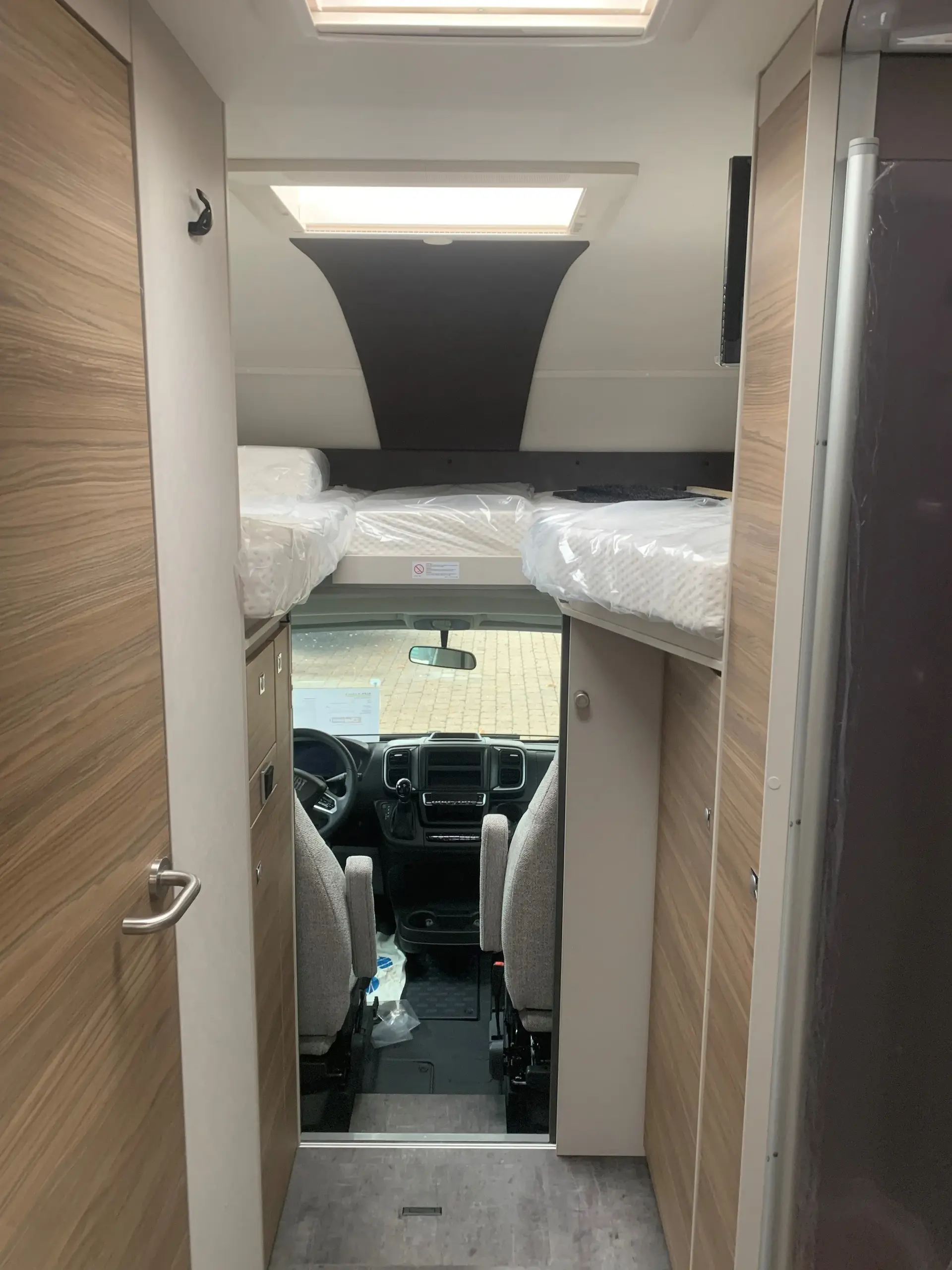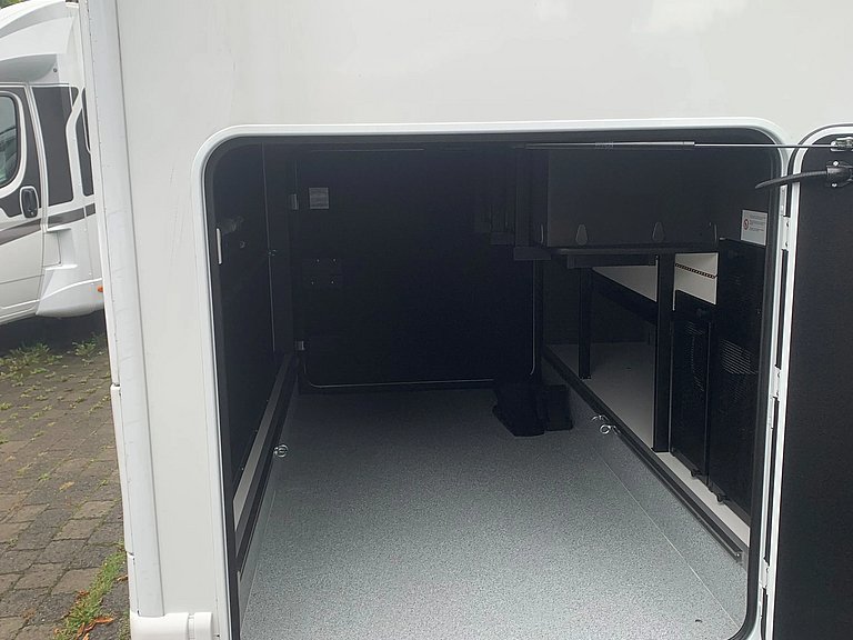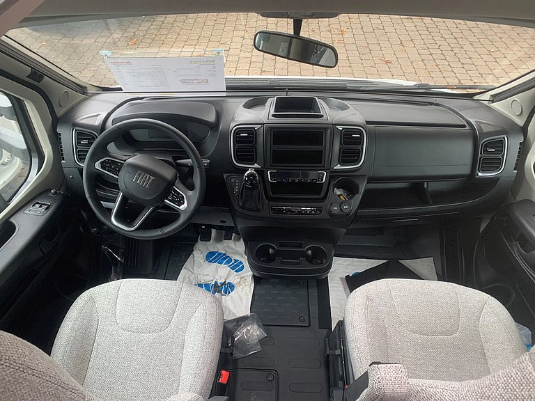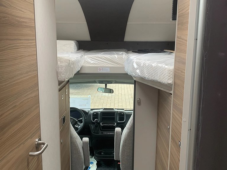 - Travel-Paket A 7820-2 (Light Moments: Indirekte Ambientebeleuchtung über den Dachstauschränken, Verdunklungsjalousien im Fahrerhaus, Dunstabzugshaube (Abluft) mit Zugluft-Stopper, Stützen (2 Stk.) für Anbau hinten, Automatische Gasflaschenumschaltung inkl. Crash Sensor, EisEx und Gasfilter, Rückfahrkamera (Einfachkamera), Panoramafenster (zweite Panoramadachhaube 75x105 cm längs über Sitzgruppe Heck) inkl. Baldachin und Raumleuchte, Zentralverriegelung für Fahrerhaus-, Wohnraumtüre und Garagentüren)
