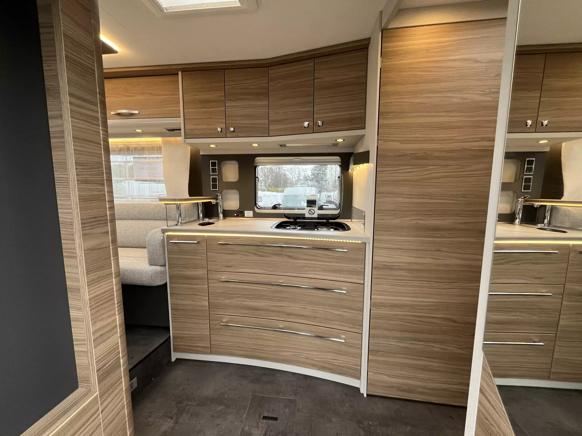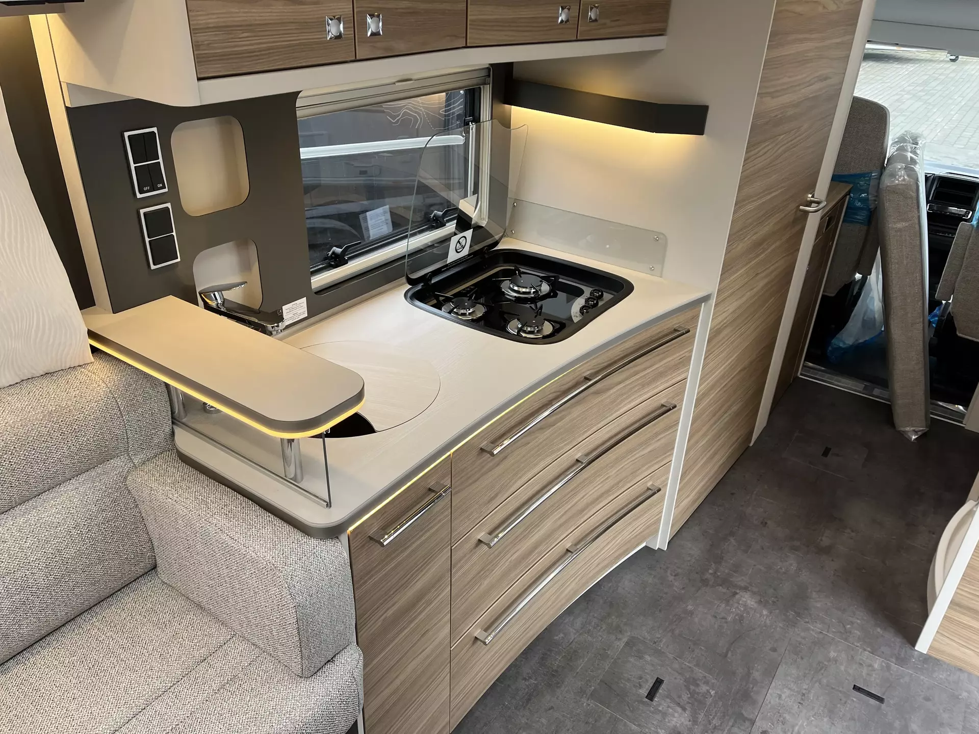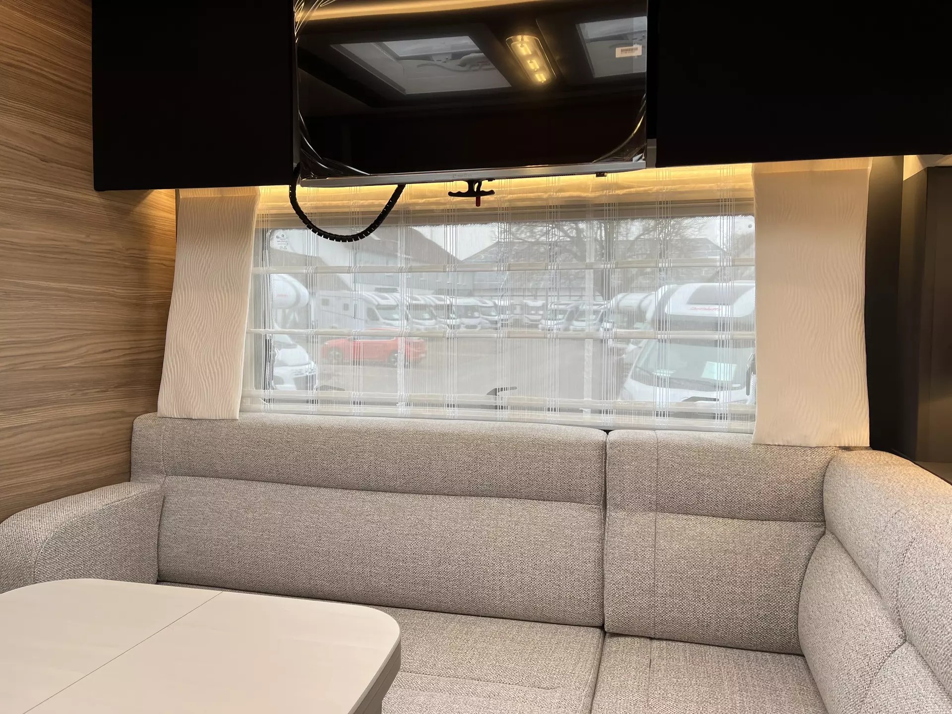 - Travel-Paket I 6820-2 (Vorbereitung für Radiosystem inkl. Soundpaket im Fahrerhaus, Light Moments: Indirekte Ambientebeleuchtung über den Dachstauschränken, Dunstabzugshaube (Abluft) mit Zugluft-Stopper, Stützen (2 Stk.) für Anbau hinten, Radioantenne DAB+ auf dem Dach montiert, Automatische Gasflaschenumschaltung inkl. Crash Sensor, EisEx und Gasfilter, Rückfahrkamera (Einfachkamera), Panoramafenster (2 x Panoramadachhaube 70x50 cm quer) über Sitzgruppe Heck, Zentralverriegelung für Fahrerhaus-, Wohnraumtüre und Garagentüren)