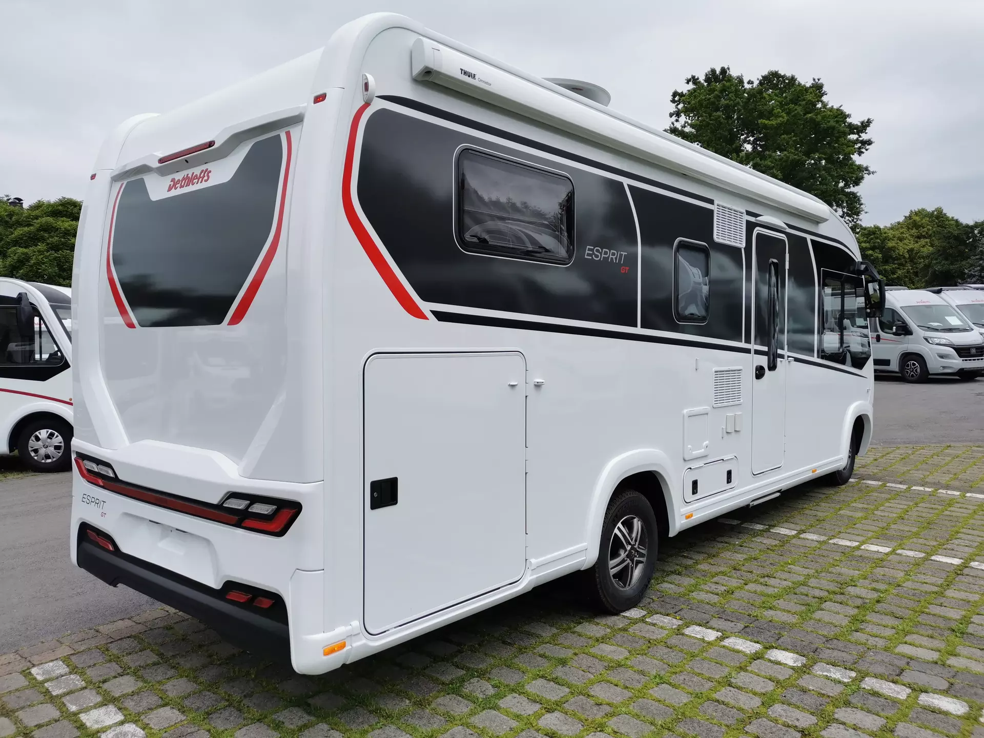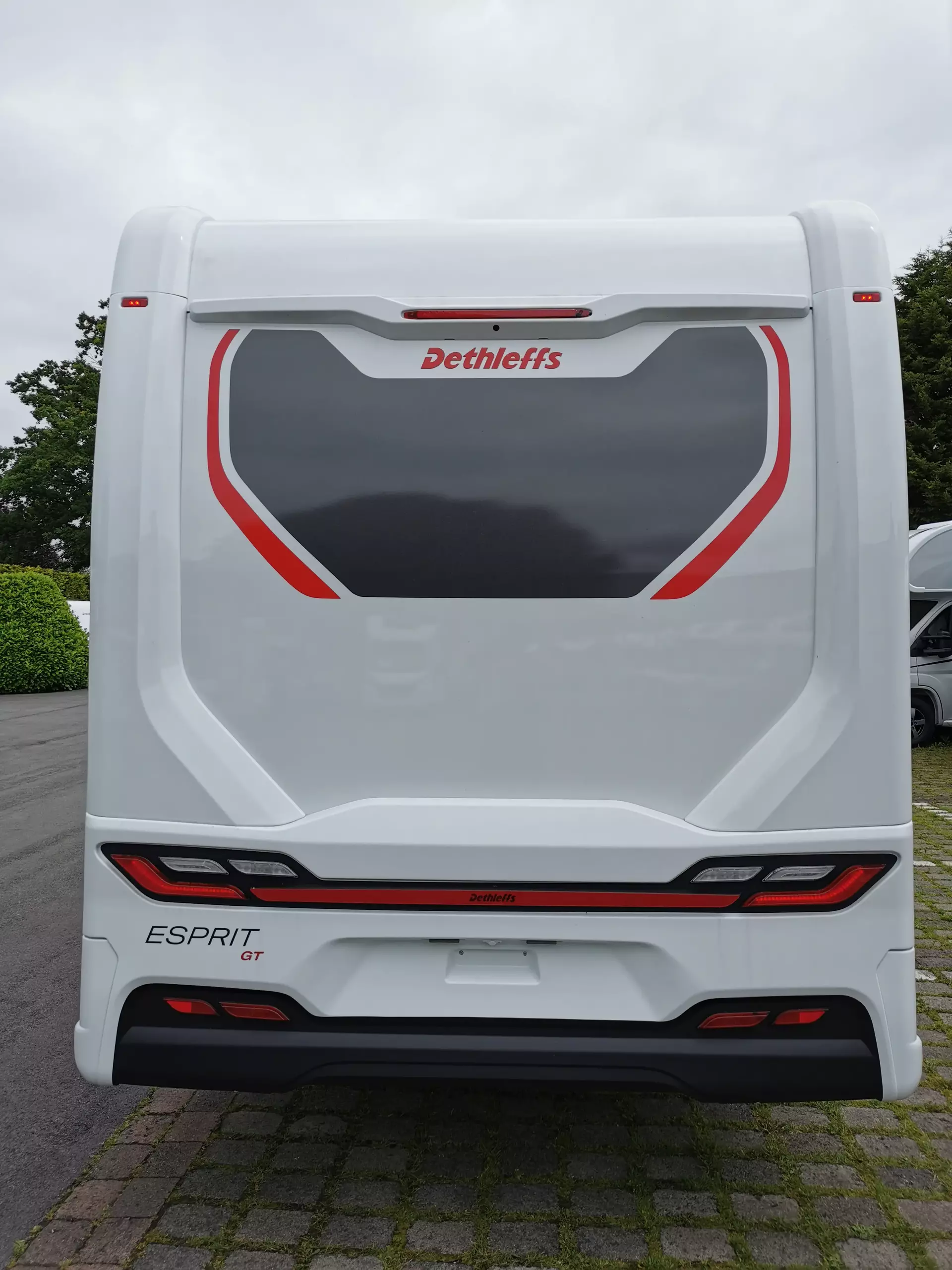 - Esprit GT Paket (LED-Abblendlicht, Sonnenblenden seitlich, als Rollo für Fahrer und Beifahrer, Panorama-Dachhaube 70 x 50 cm im Schlafraum, Innendesign GT inkl. erweiterter Küchenrückwand, Außendesign GT Advance (Heckleuchtenträger mit schwarzem Diffusor, lackierung I-Front teilweise schwarz, Kühlergrill mit Chromkeder, Skidplate "rot"), Hoher charakteristischer Dethleffs Exklusiv Heckleuchtenträger mit ShapeLine LED Rückleuchten, in Heckspoiler integrierter 3. Bremsleuchte und eingezogener Heckwand)