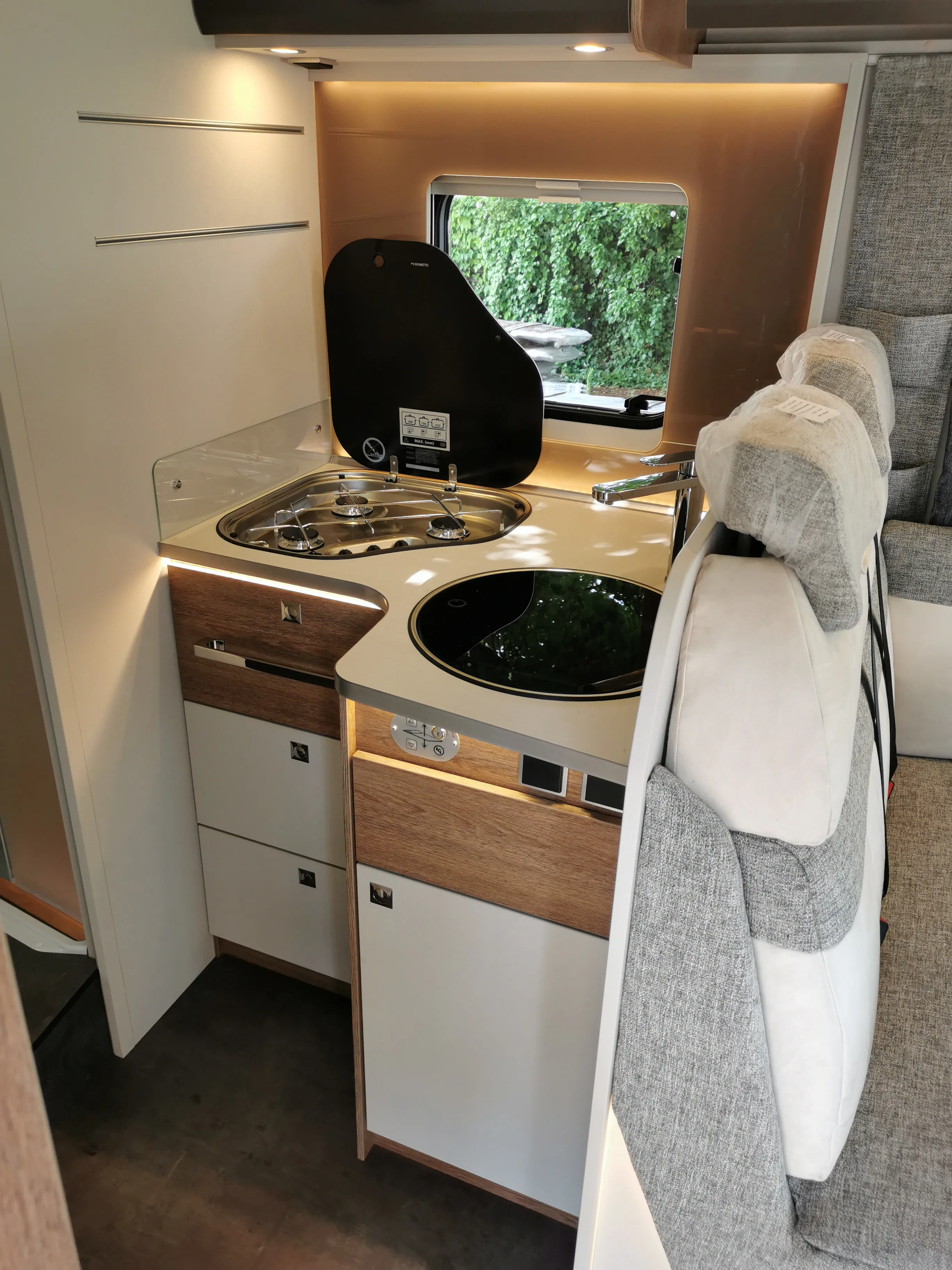 im Wohnraum, Vorzeltleuchte 12 V, Radioantenne DAB+ im rechten