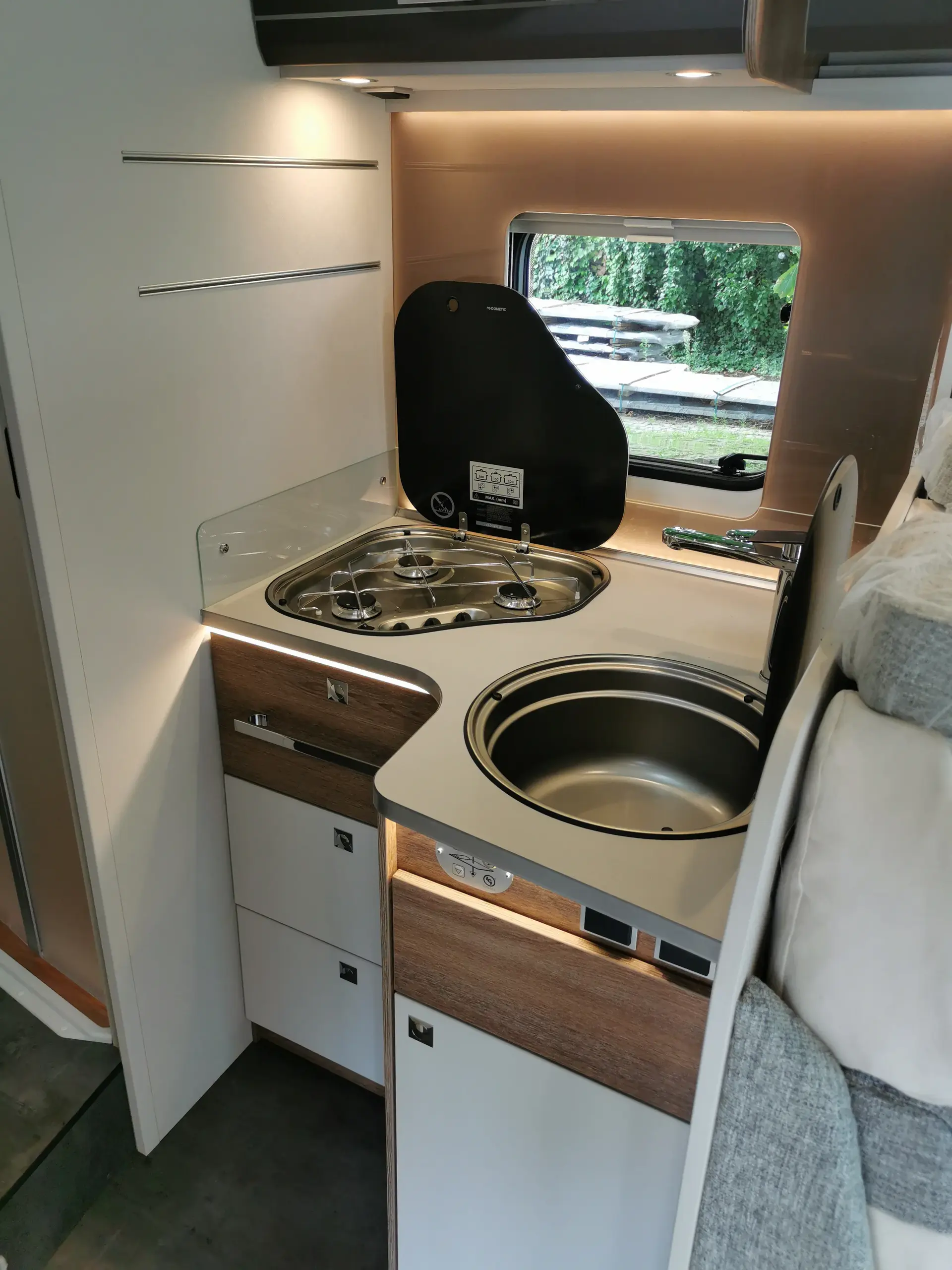 im Wohnraum, Vorzeltleuchte 12 V, Radioantenne DAB+ im rechten